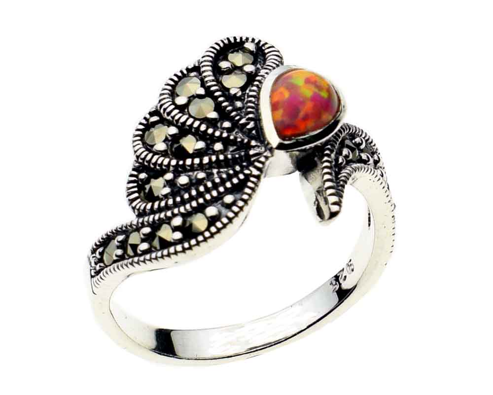 Ring Marcasite Feather Effect Design Tear Drop Pink Fire Opal Stone 925 Sterling Silver