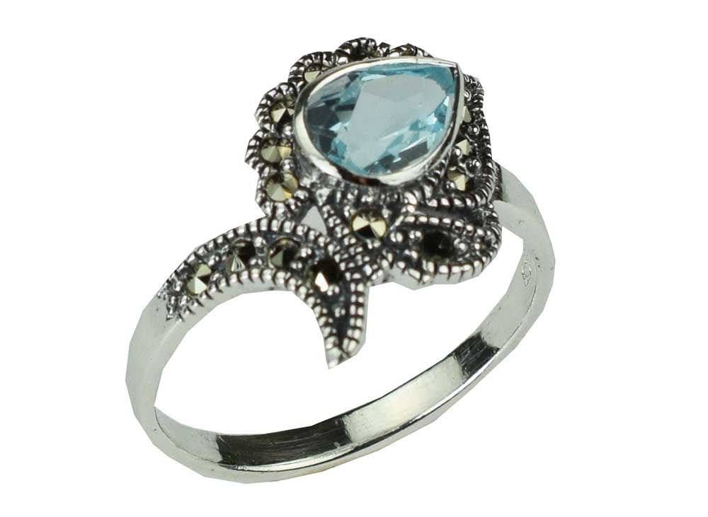 Ring Marcasite Cut Flower With Blue Topaz Teardrop Stone 925 Sterling Silver