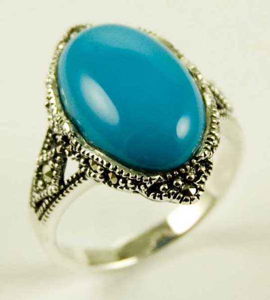 Ring Marcasite Turquise Large Oval Stone With Fancy Marcasite Stone Border 925 Sterling Silver