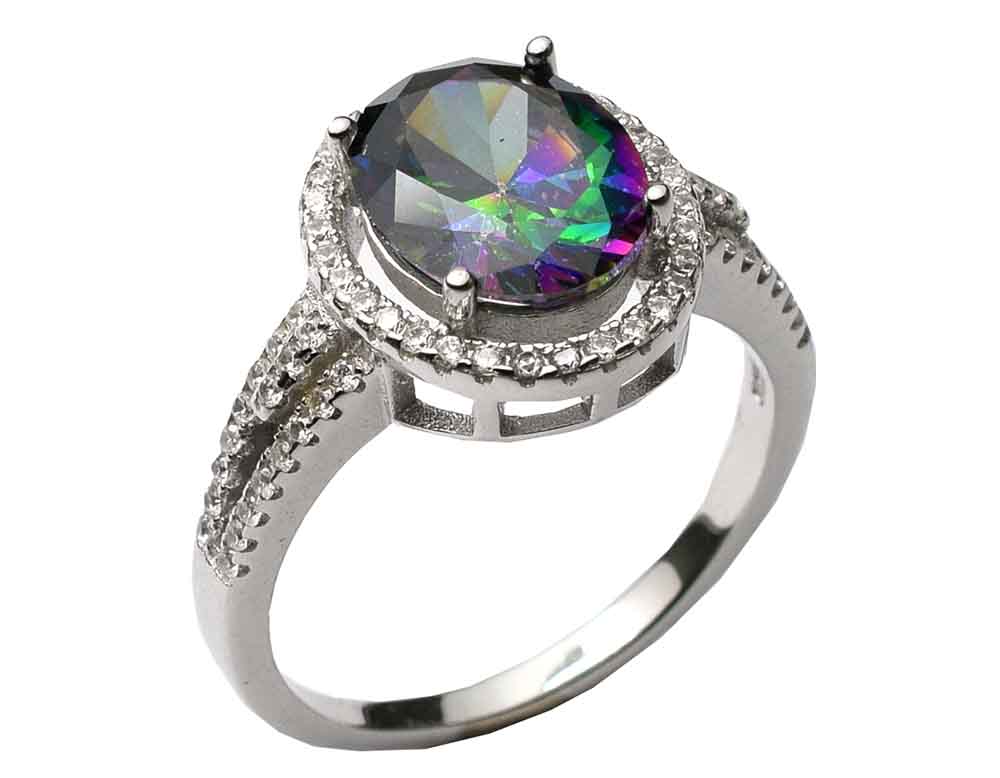 Ring Oval Mystic Quartz Stone With Cubic Zirconia Border And Double Sides 925 Sterling Silver