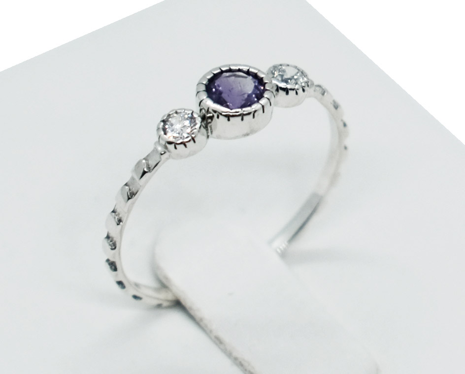 Silver Ring Round Amethyst with 2 Clear Stones 925 Sterling Silver