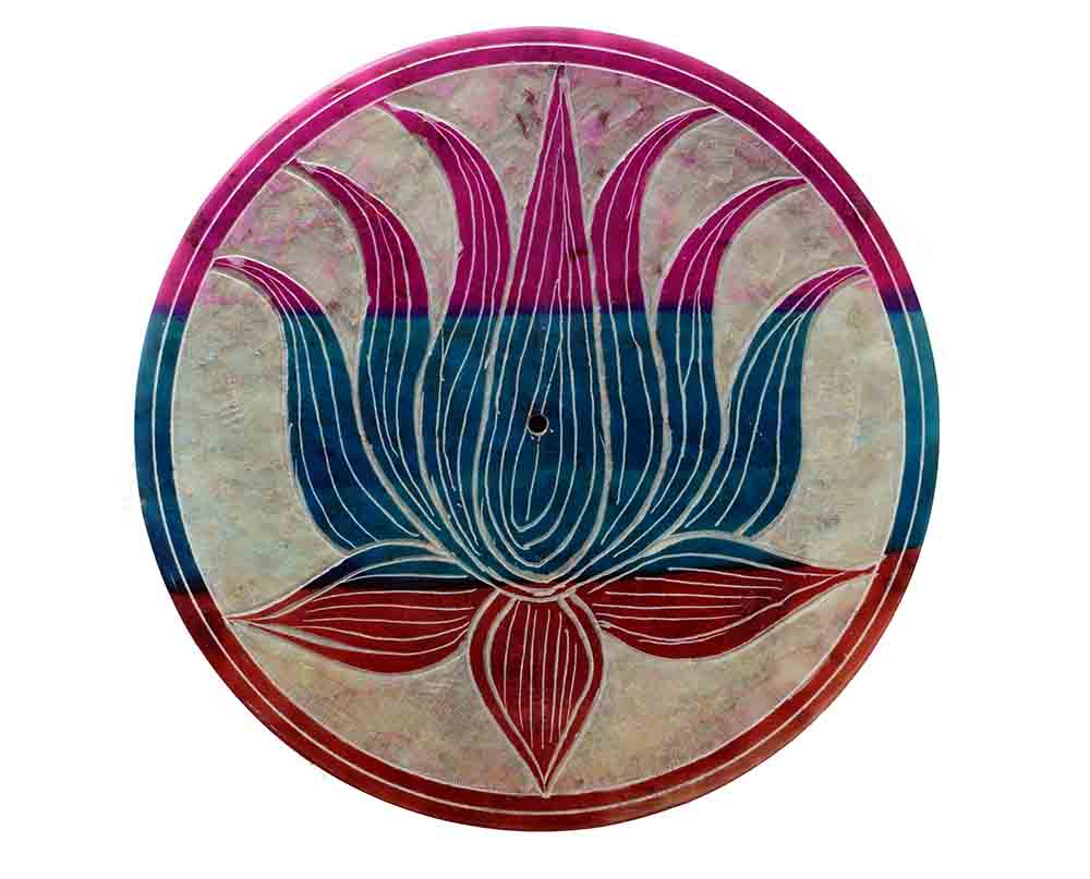 Soapstone Incense Plate 4″ Carved with a Multicolour Design of Lotus Flower -Set of 2 in a Box