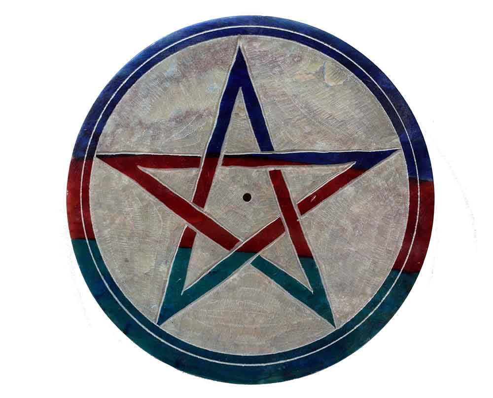 Soapstone Incense Plate 4″ Carved With Multicolour design of Pentagram -Set of 2 in a Box