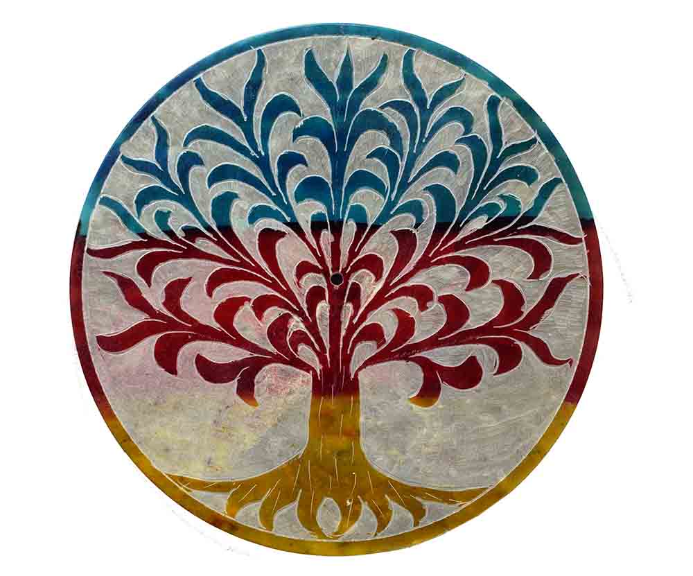 Soapstone Incense Plate 4″ Carved with Multicolour Design of Tree of Life Set of 2 in a Box