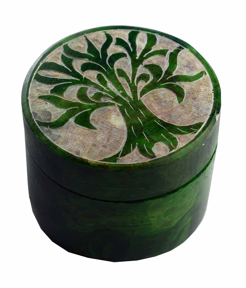 Soapstone Round Box 2″ Diameter With Carved Tree of Life (Green) 2 in a box