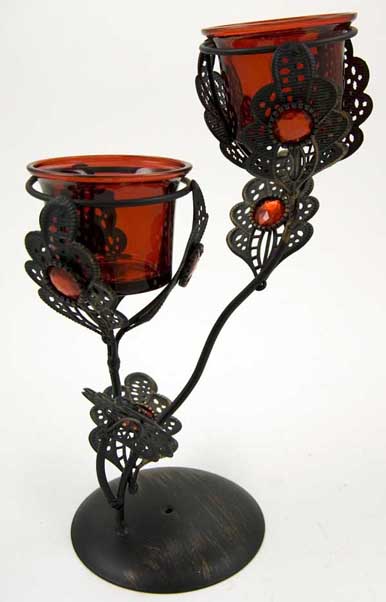 T-Light Holder With Double Red Glass Cups And Flowers H22.5cm