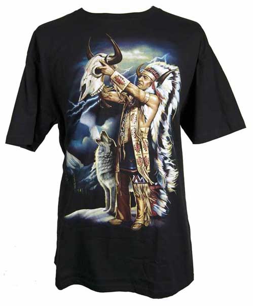 T-Shirt Large Indian Standing Holding Buffalo Head